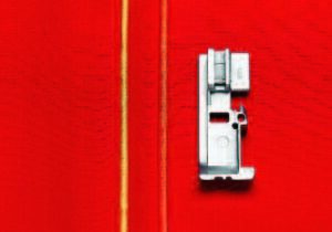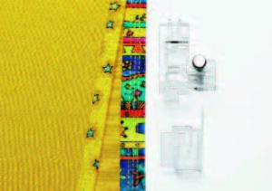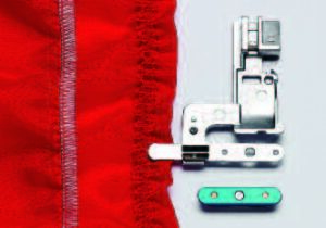 Questo piedino consente un posizionamento perfetto delle file di perle con un punto flatlock. Il bordo del tessuto viene ripiegato in modo preciso durante l’applicazione delle perle.