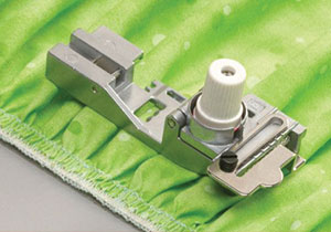 In un’unica operazione crea un arricciatura su tessuti leggeri o di medio peso, rifinisce i bordi, cuce l’arricciatura su un tessuto piatto ed esegue un sopraggitto. Ideale su capi di abbigliamento e tendaggi.